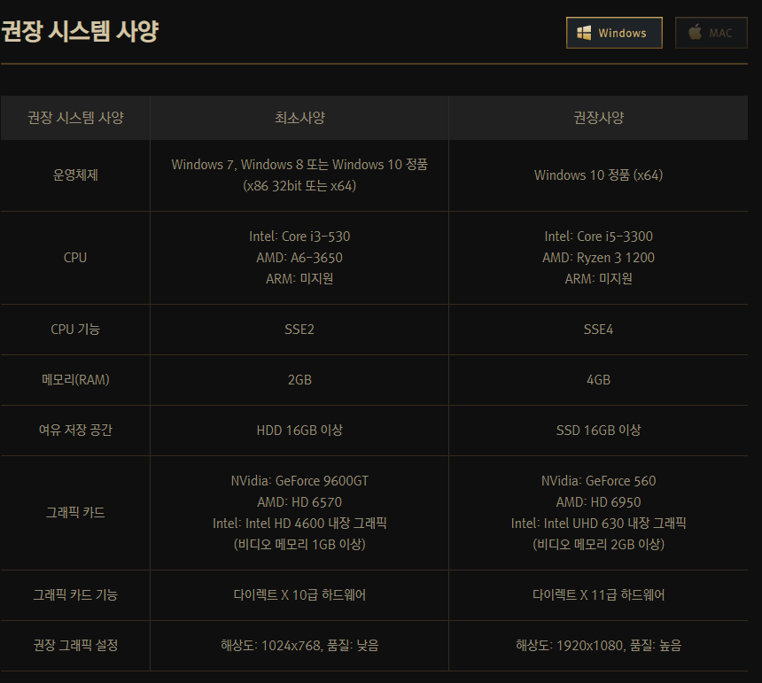 - cpu : intel core i5-3300 / amd ryzen 3 1200 / arm λ―Έμ§μ