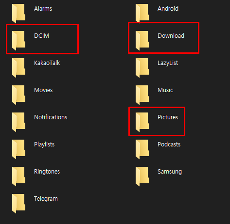 ํด๋ํฐ์๋ ๋ค์ํ ํด๋๊ฐ ์์ต๋๋ค. ์ผ๋ฐ์ ์ผ๋ก ์นด๋ฉ๋ผ๋ก ์ฐ์ ์ฌ์ง์ด ์ ์ฅ๋ ํด๋๋ 'DCIM'์ ๋๋ค. ๋ค์ด๋ก๋ ๋ฐ์ ํ์ผ์ 'Download' ํด๋์ ์์ต๋๋ค. ๋ณ๋์ ์ฑ์์ ์ ์ฅ๋ ์ฌ์ง์ ๊ฒฝ์ฐ 'Pictures'์ด๋ฉฐ, ๋์์์ ๊ฒฝ์ฐ 'Video' ํด๋๋ฅผ ํ์ธํ๋ฉด ํ์ผ์ ๋ณผ ์ ์์ต๋๋ค.